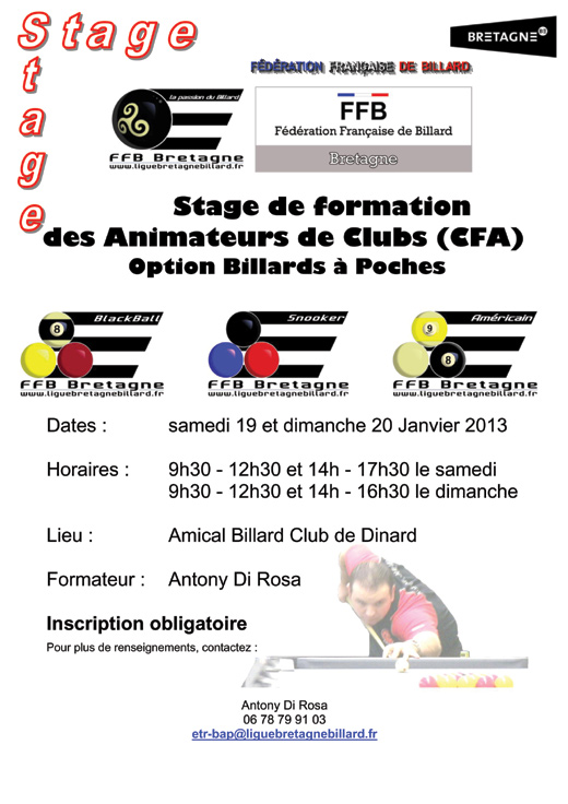 La Ligue de Billard de Bretagne vous propose une formation au Certificat Fédéral d’Animateur de Club (CFA) option Billards à Poches les 19 et 20 janvier prochains, ouverte à tous quelque soit votre niveau de jeu. L’Amical Billard Club de Dinard vous recevra dans sa chaleureuse salle.